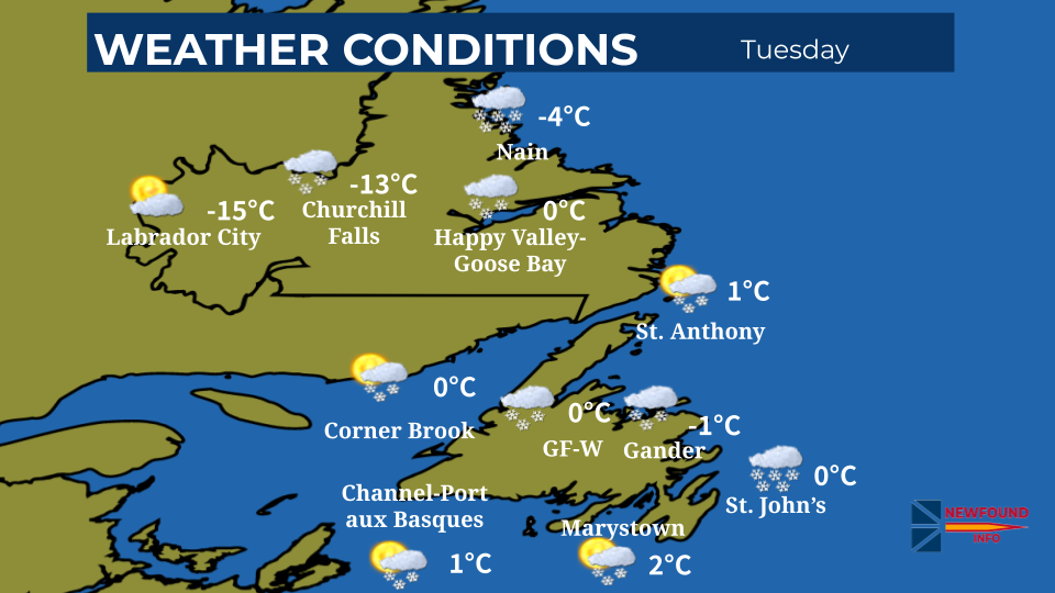 A mix of snow, flurries and milder temperatures is forecast across Newfoundland and Labrador on Tuesday, with conditions varying significantly by region.